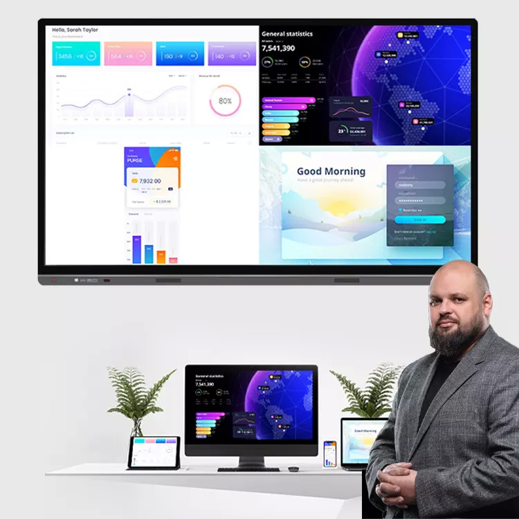 1. Ekran dotykowy z jakością obrazu 4K UHD, duży ekran jest bardziej delikatny i zapewnia doskonałą przyjemność wizualną, aby bardziej zaangażować odbiorców.